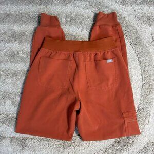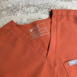 Stylish Figs scrub set. Rust top with short sleeves. Matching rust pants with pink drawstring. Comfortable and professional.