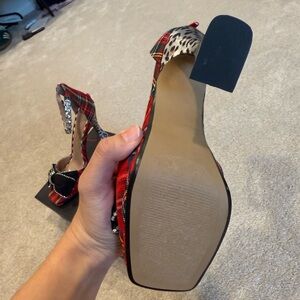 Brand New Betsey Johnson Guliana heeled sandal with a plaid print, embellished bow, and crystal ankle strap