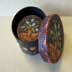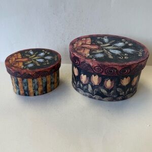 "Bob's Boxes" brand Decorative Small Oval Boxes in the "Primitive Tulips" featuring the artwork of Karen Hillard Crouse. Features vibrant colors and intricate design. GUC with no rips tears or stains.