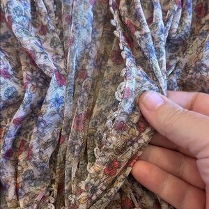 Beautiful boho floral mesh top with ruffles and smocking. Excellent condition but missing the ribbon to lace up the top. Leave as is or grab a ribbon at the craft store!