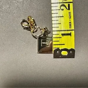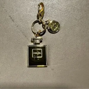 Elegant gold keychain with iconic perfume bottle design. Features CHANEL logo charm. Perfect accessory for any collection.