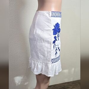 Chic and stylish, this white skirt features beautiful blue floral embroidery. Perfect for any occasion.