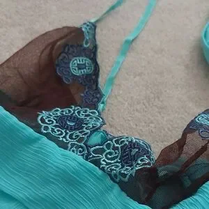 vintage lingerie set Chic turquoise chemise with brown lace accents. Features delicate straps and ruffled hem. Perfect for a stylish night in.Like new