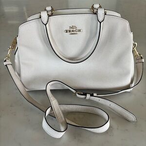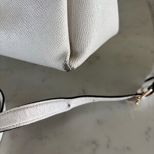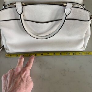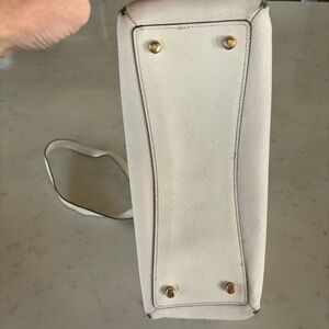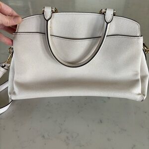 Creamy white, has some signs of wear on the corners and straps, multiple pockets, removable crossbody strap, metal feet, still a lot of life left!