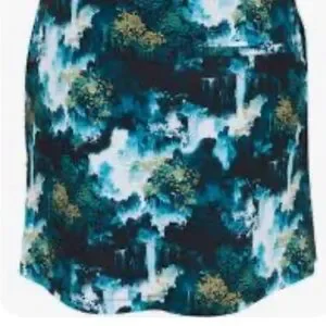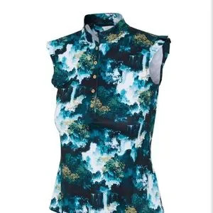 Stylish sleeveless top with a unique blue and green print. Features a buttoned front and stand-up collar. Ideal for casual outings.