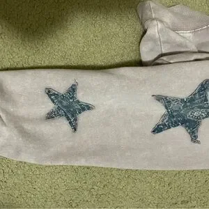 Well loved but in great shape. Light lavender size small, is oversized. Fits more like medium. Handkerchief material stars on both sleeves. No holes, stains, tears. From smoke free pet free home.