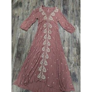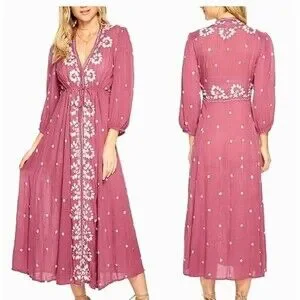 Free People Embroidered Fable Midi Dress Raspberry Pink Mauve Festival Sz Small