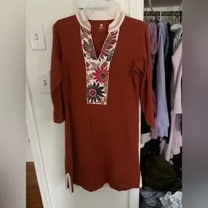 Stunning rust midi dress with 3/4 sleeve. Beautiful detailed flowered v neck and collar. Light weight. Dress up or down.
