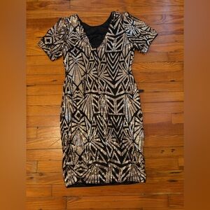 Dazzle in this black mini dress with silver sequins. Features geometric patterns. Ideal for parties. Back zip. Never worn.
