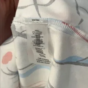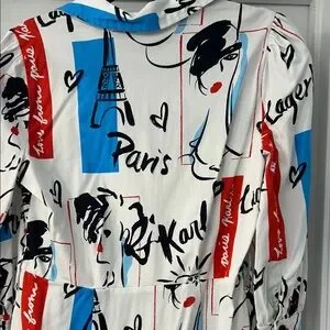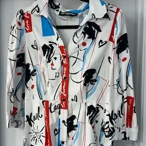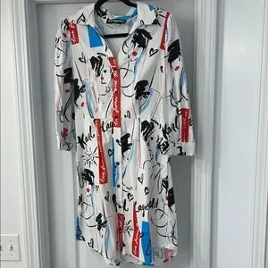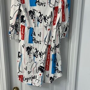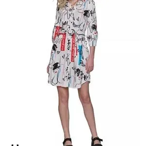 This is a Karl Lagerfeld Paris mini shirt dress in a white, multi-color satin-blend fabric with a graphic print, 3/4 length sleeves.