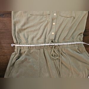 Stylish green sleeveless romper with button details and drawstring waist. NWT and no callouts. Adorable detailing on the cuff sleeves. Elastic and drawstring waist. Back pockets.