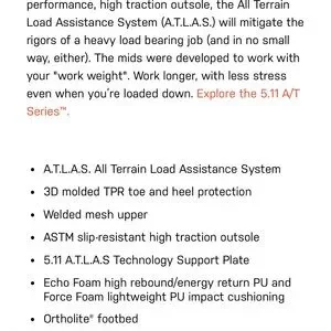 5.11 hiking/rucking/tactical boots. Have only been worn 4 to 5 times no more than an hour each time for short box around the neighborhood. They have an internal stabilization system for weight transfer when rucking. CV attached description from 511’s website.
