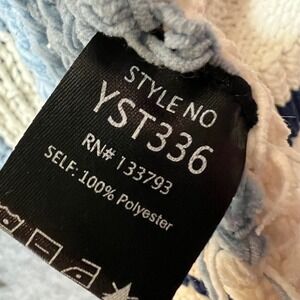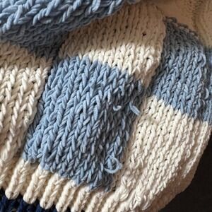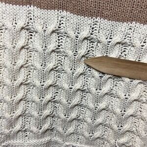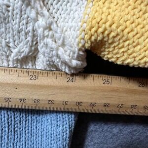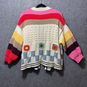 POL cardigan sweater in size medium showcasing a vibrant patchwork of knit stripes and crochet granny squares. Features a classic cable knit panel on the front and sleeves, a checkered knit pattern on the lower front and back, and a ribbed hem and cuffs. Front button closure. Has some pulled threads, see photos.