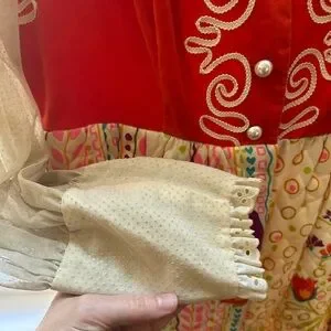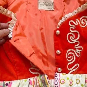 + Orange velvet bodice with pearl buttons, lace trim, sweetheart neckline and ribbon appliqué in swirled pattern