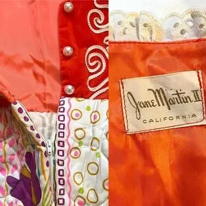 Jane Martin was a designer known for her unique, handmade creations, popular in the 1960s and 1970s. Her distinctive, bohemian style often featured quilted materials, intricate stitching, patchwork, vibrant embroidery and/or appliqués.