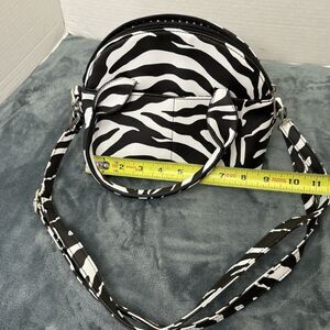 The Olivia & Kate Zebra Striped Dumpling Bag is a stylish satchel/top handle bag designed for women. Made from faux leather, this bag features a striking black and white striped pattern with a zip and button closure. The exterior and interior are both in black and white, adding a classic touch to the design. The bag is perfect for carrying your everyday essentials in a unique and fashionable way, making it a standout accessory for any outfit.