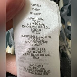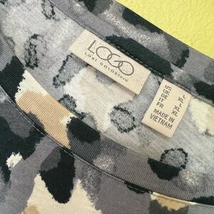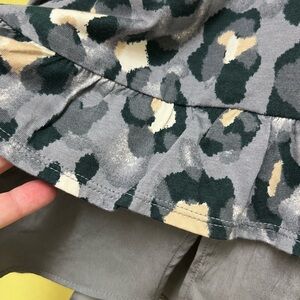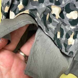 Stylish long sleeve top with a bold leopard print. Features a mix of gray, cream, black and lavender tones. Gray ruffle at the hem matches up with the playful pattern.