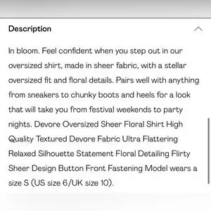 In bloom. Feel confident when you step out in our oversized shirt, made in sheer fabric, with a stellar oversized fit and floral details. Pairs well with anything from sneakers to chunky boots and heels for a look that will take you from festival weekends to party nights. Devore Oversized Sheer Floral Shirt High Quality Textured Devore Fabric Ultra Flattering Relaxed Silhouette Statement Floral Detailing Flirty Sheer Design Button Front Fastening Model wears a size S (US size 6/UK size 10).