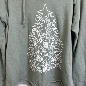 Cozy green hoodie featuring a white Christmas tree graphic. Perfect for festive occasions.