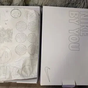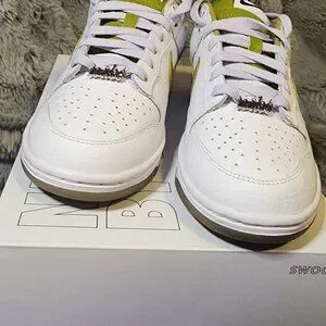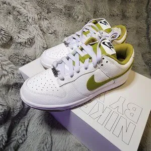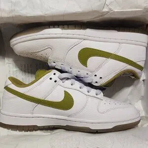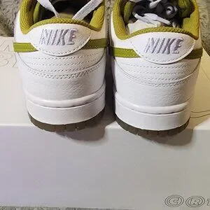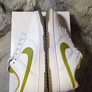 Never worn. Olive green swoosh & light lilac shoelaces. The rest of the shoe is white.