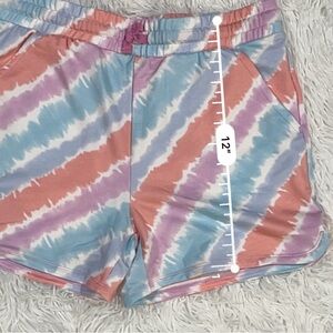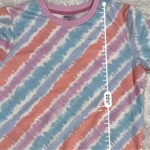 This adorable two-piece lounge set features soft pastel tie-dye stripes in pink, blue, lavender, and white. Designed for comfort and style, it includes a cozy long-sleeve top and matching shorts with an elastic waistband — perfect for lounging or casual play.