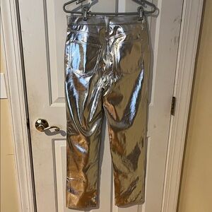 Shiny silver straight leg pants. Sleek and stylish design. Perfect for a bold look.