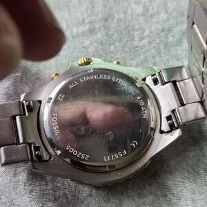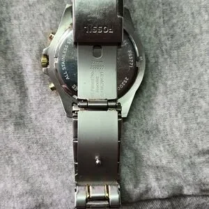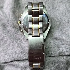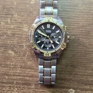 Elegant Fossil watch with gold and silver accents. Features a black dial and chronograph. This is used no box or papers. New battery installed.