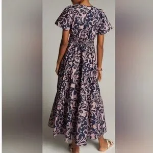 Elegant maxi dress with a navy base and pink floral pattern. Short sleeves and flowing silhouette. Perfect for any occasion.