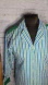 Stylish striped button-up shirt featuring blue, white, and green colors. Perfect for casual wear.