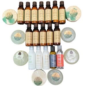 Indulge in a luxurious bath experience with this natural bath and body set. Featuring soothing creams and refreshing soaps, this collection is perfect for pampering yourself. Enjoy the calming cream and tan tones that complement any bathroom decor.