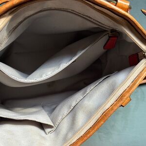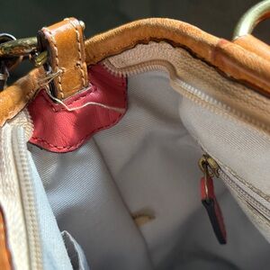 Purse shows signs of wear on crossbody strap and has some loose threads. There is a stain on the interior that could likely be cleaned, I just have not gone through the effort to do so. There are minor marks here and there on the patent leather. I have tried to photograph any flaws I could find up close - these are not noticeable when using and wearing the bag out and about.