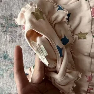 Never worn! Adorable cream dress with colorful star patterns. Features ruffled details and long sleeves.