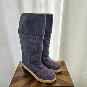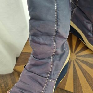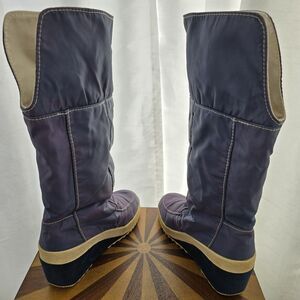 Vintage 70s Nordica Platform Winter Boots. Iridescent blue/purple color. Blue Platform Wedge heel. Pull on. Sherpa lined. Top can be folded down.