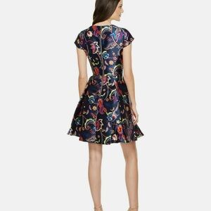Chic mini dress with vibrant floral pattern. Features a flattering fit and flare design. Ideal for stylish outings.