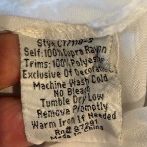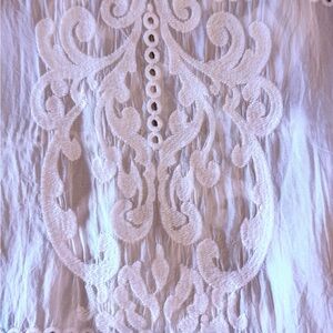 This iconic Johnny Was chic white blouse has intricate embroidery and a flowing and stylish design. Perfect for casual elegance. Very versatile - can be dressed up or down. Roomy boxy fit. Semi sheer cupra nylon. Sleeves drop from shoulder. Scoop neck. Scalloped edges. Split each side at bottom hem.
