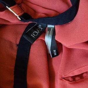This is a Womens Ravel Semi Sheer, Burnt Orange, Blouse Sz M. The shirt measures 21 inches armpit to armpit, from top of the collar to the hem 26 inches and the sleeves are 3/4
