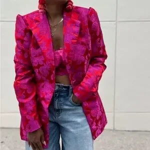 Elevate your style with this stunning pink floral jacket. Perfect for any occasion, this jacket adds a touch of elegance to your wardrobe.