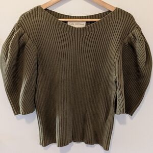 Voluminous puff sleeves and a cropped silhouette pair up perfectly on this modern and romantic sweater from Mara Hoffman. Olive, with a boat neckline that comes to a slight V in center.