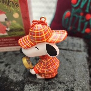 Charming Snoopy ornament in detective attire. Features red and yellow plaid design. Perfect for holiday decor.