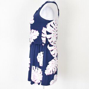 Navy blue with white and pink palm leaf print.