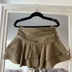 Trendy olive mini skirt featuring playful ruffles. Ideal for versatile styling. Size S
