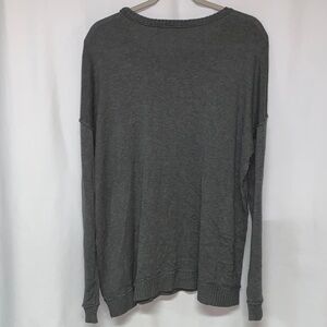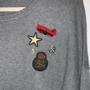 Stylish gray crewneck sweater by Ralph Lauren. Features unique embellishments for a trendy look. Some pins are removable. Perfect for the holiday season or casual wear.