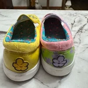 Playful slip-ons with SpongeBob and Patrick designs. Bright pink and yellow hues.