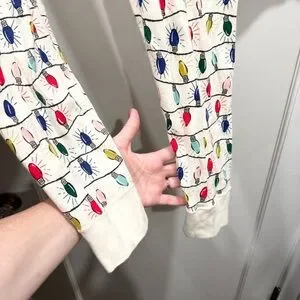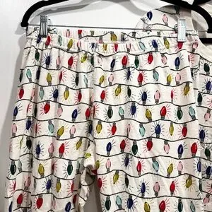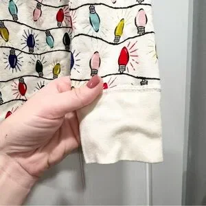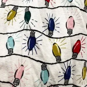 Color: white with multicolored Christmas light bulb novelty print throughout