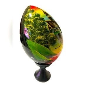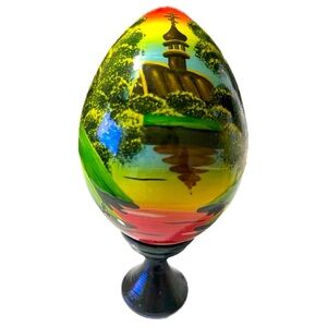 This is a very good condition, vintage Russian egg shape, hand painted wood, with a Church on the front. This stands 4 1/4 inches tall. Beautiful color, design and condition.