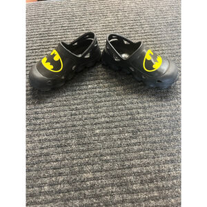 These pre-owned black Batman water shoes feature a prominent yellow Batman logo on the toe of each shoe. The shoes are made of a flexible, possibly rubber or EVA foam material, with ventilation holes on the sides. The soles have a textured, non-slip pattern with various raised shapes, including a visible "11/12" size marking on one sole. The interior footbed also displays the Batman logo and "Made in China" text, along with additional manufacturing details. Minor scuffing and wear are visible on the soles.
