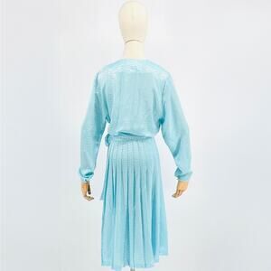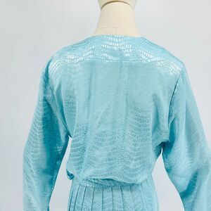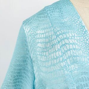 This stunning piece features lustrous aqua snake-textured fabric with a flattering surplice wrap bodice, long blouson sleeves with button cuffs, side-tie closure, and pleated midi skirt for sophisticated daytime elegance.