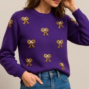 Sweet bow-core perfection 💜 This vintage Dana Scott sweater features scattered gold and pearl beaded bow appliqués on a rich purple knit – very late-80s/early-90s charm. Made from a cozy ramie/cotton blend, it has a classic crew neckline, long sleeves, and ribbed trim at the cuffs and hem. The bows are done in gold bugle beads with faux pearl strands, placed across the front and on each shoulder for that extra festive touch.