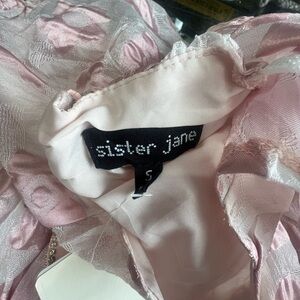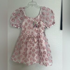 Elegant dress with floral pattern. Features puff sleeves and a satin bow. Perfect for formal occasions.