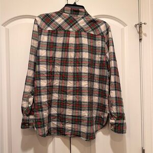 Vibrant plaid shirt with button-down front. Ideal for casual wear.